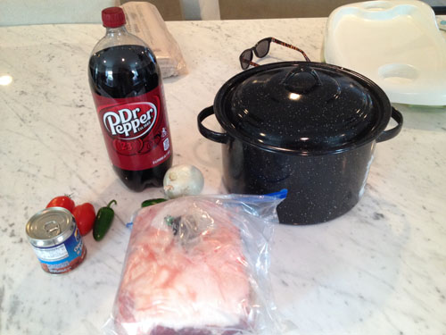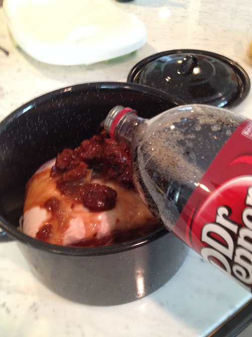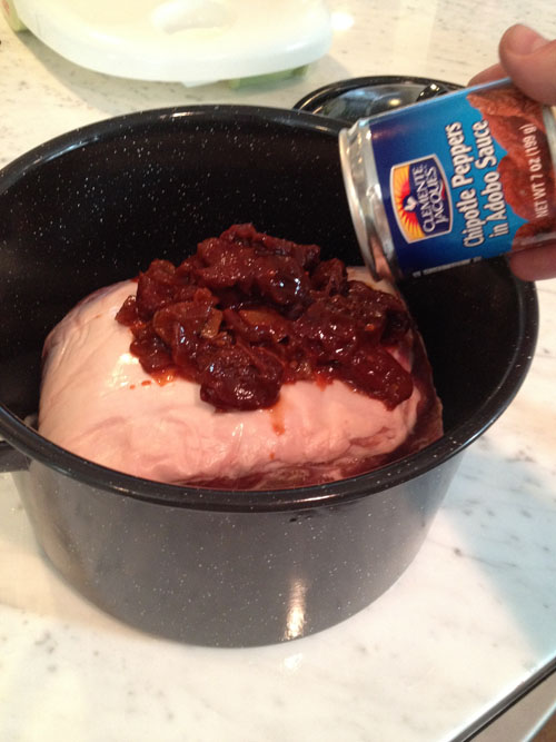 Once the fresh veg is in the pot – place the pork (that you’ve already salt and peppered) in the pot – then dump 1 can of chipotles in adobo over the butt, then ½ a liter (or 2 cans) of Dr. Pepper. I also added 4 Tbsps of brown sugar – again, something you can keep or omit here. And that’s it – you’ve prepped and put everything together that you need.