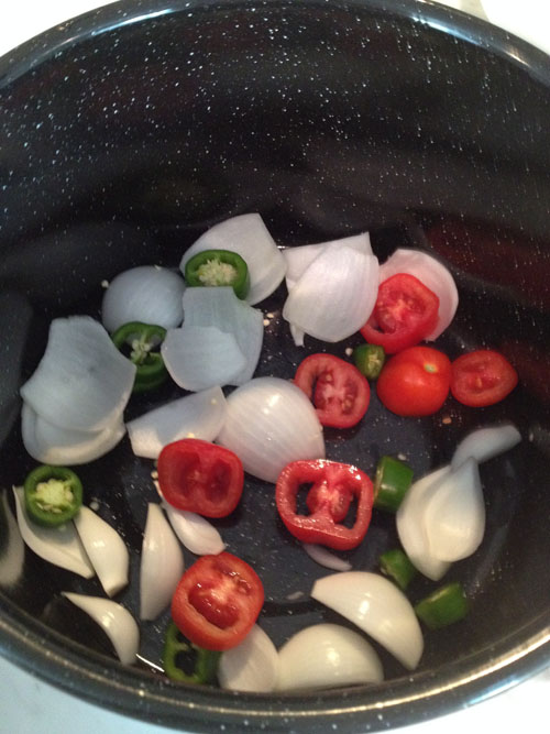Once your pork butt is prepped, rough cut 1-2 onions (small whites for me) and place in the bottom of your pot. For my pot, I used a regular camping grade pot that I picked up at Wally World – anything with a heavy bottom and a lid will work. I also through in some tomatoes that I had lying around from the garden and a jalapeno for extra bite. You can leave these out and everything still works just fine – or throw whatever else you have laying around in the pot too – garlic wouldn’t hurt here.