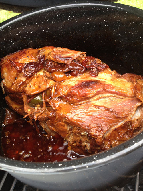 Now it’s time to put your concoction on the BGE – remember your temp is holding steady at 300-325 degrees dome temp. If all of that checks out – place the pot on the grill with a tight lid and close the dome – don’t open it again for 3 hours.