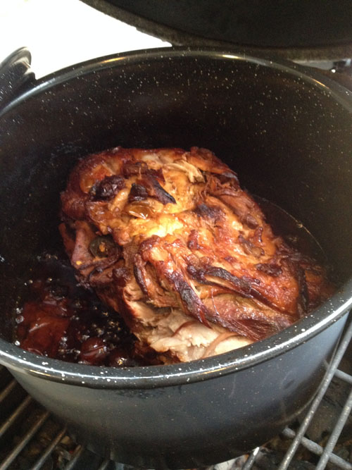 After 3 hours, open the BGE, turn the roast in the pot (flip it over) and shut everything again for another 3 hours.
