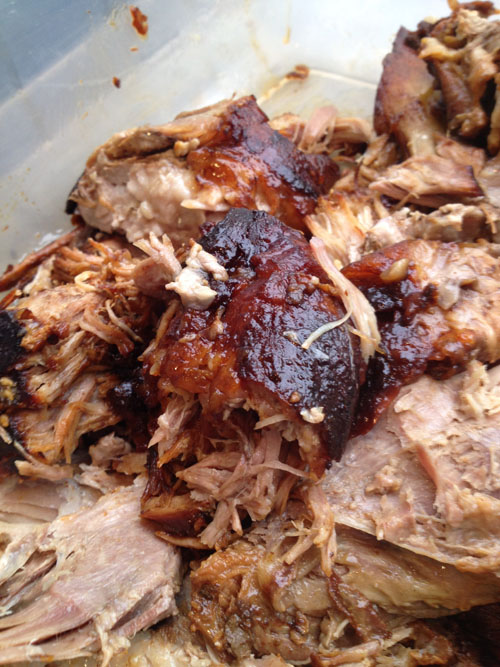 Shut the Egg down to a holding temp of 200 degrees and remove the Pork Butt from the BGE. Once back inside your kitchen, remove the butt from the pot – preserving all of the liquids for later. Shred the pork and try not to snack it all away while you prepare the sauce.